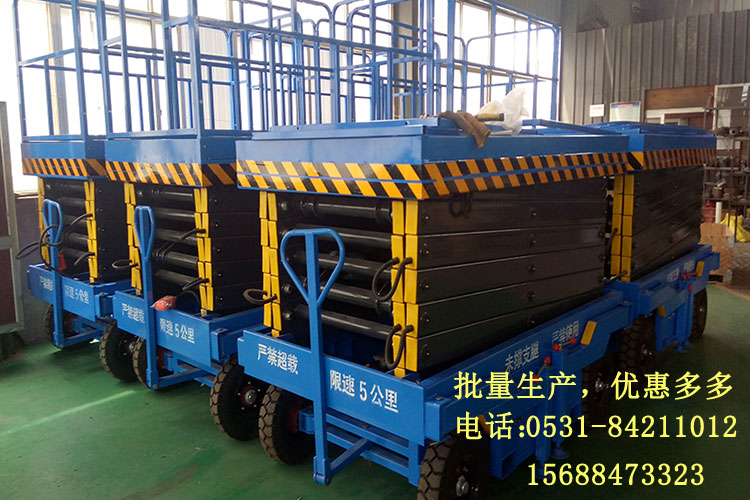 移动式升降机有人工移动式升降机、电动移动式升降机,另备有手压泵,供停电时使用,具有移动灵活、升降平稳、操作方便、载重量大等特点。升降动力分为220V或380V电源,采用国外和国产液压泵站。主要适用于工厂、物业单位、商店装潢、建筑、装饰、场馆馆布置、会议中心等行业。